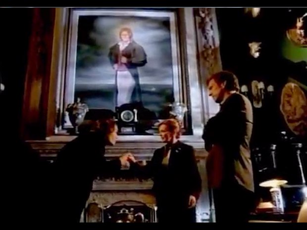 SHADOWS IN THE '90s: The Dark Shadows Concordance 1991 - PLOT SUMMARIES - MINISERIES PART TWO (EPISODES TWO AND THREE): WOODARD'S HOME: Woodard impatiently asks the person on the other end of the phone if Patterson has returned yet. The phone cuts off. He slams it down. A cat yelps. He starts, then says, "Sebastian, that's not a good thing to do to an old man." A window flies open, then something falls. He goes downstairs, calling to his cat. Barnabas, from behind, grabs his throat. Woodard yells in terror. Barnabas, coldly, "You've made a serious mistake, Professor. Your foolish curiosity has now brought you into my bleak universe..."
