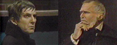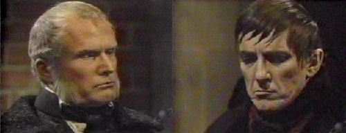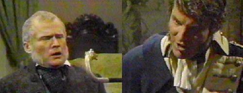 Nathan first tries to tell Joshua he and Millicent are in love, but that's one sentimental argument that doesn't sway Joshua, who calls Forbes a liar and hypocrite. It would be to Joshua's advantage to make him part of the Collins family circle, says Nathan, and Joshua puffs up against what sounds like a blackmail threat. Forbes tells him he knows the truth about Barnabas. This makes the old man extremely nervous and upset (Louis Edmonds turned in a stunningly fantastic performance here!) You can see him wondering, terror-stricken, if Nathan learned Barnabas died of the plague. Nathan informs Joshua he knows Barnabas never went to England--he's still in Collinsport, and has been seen-by Millicent, Maude Browning, Suki (who named Barnabas as their attacker), and Nathan himself! "Preposterous!" moans Joshua, who takes all these pieces of evidence like blows to his face and body. He can barely walk, his face is taut with disbelief and horror. Maude described being attacked by a man who looked exactly like Barnabas, continues Nathan relentlessly. He spotted Ben in Maude's room, followed him to the Old House, looked through the window, and saw Barnabas there!