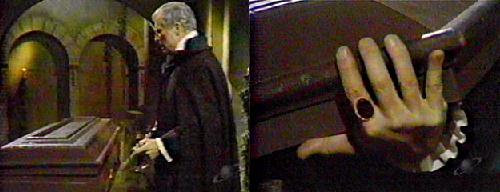 Joshua enters the cellar, pistol in one hand, a lantern in the other; he spots the coffin. He's terrified when it begins to open, and the first thing he sees is his son's black onyx ring. "Barnabas!" the stricken father cries, horrified.