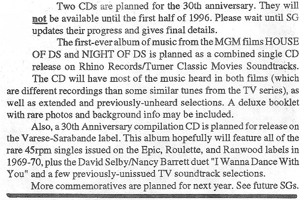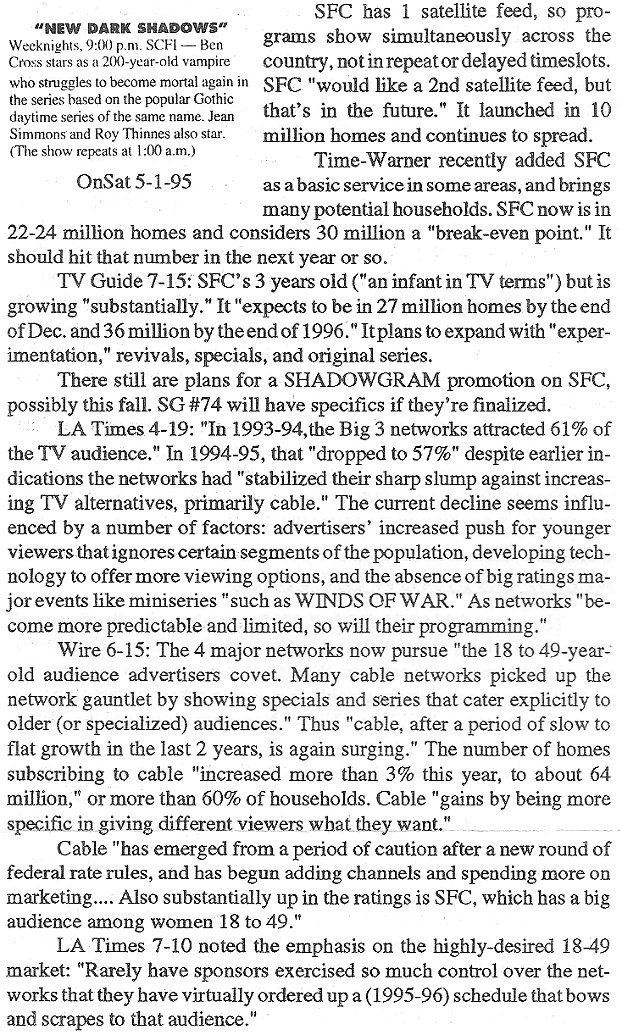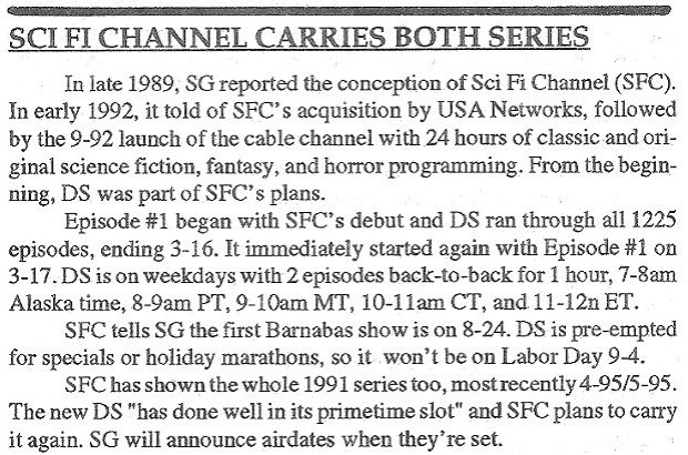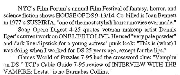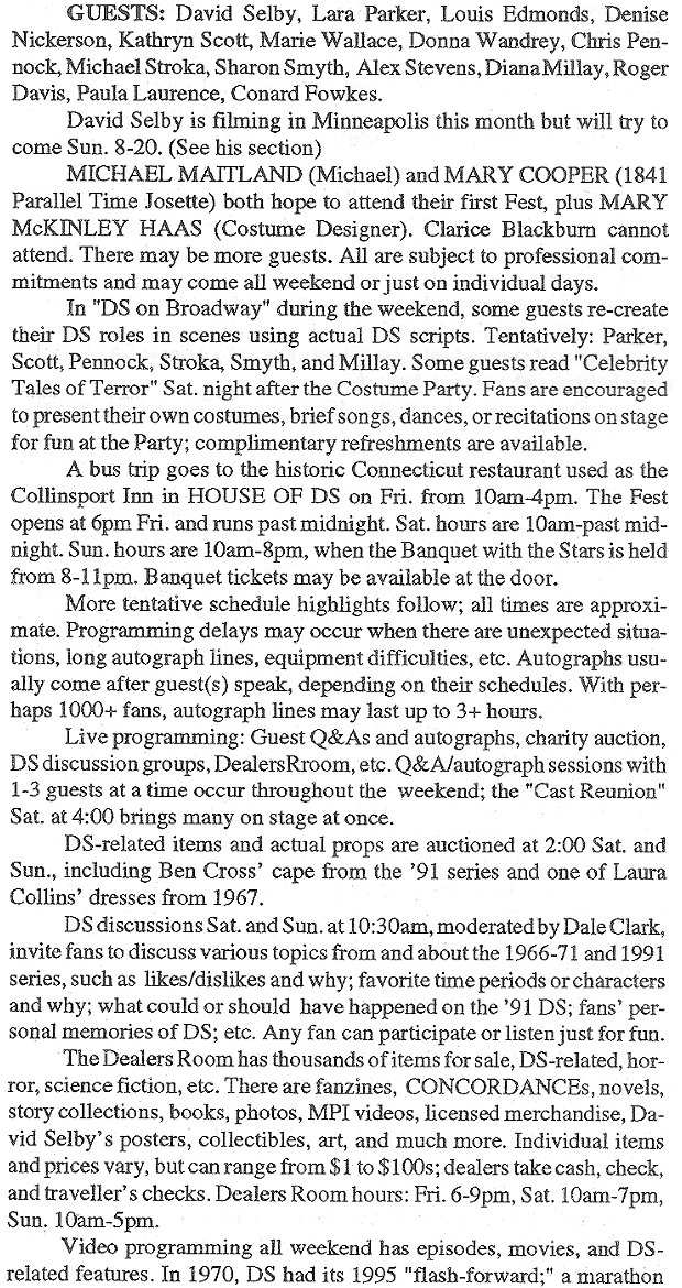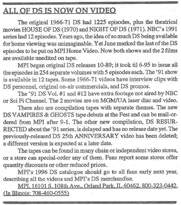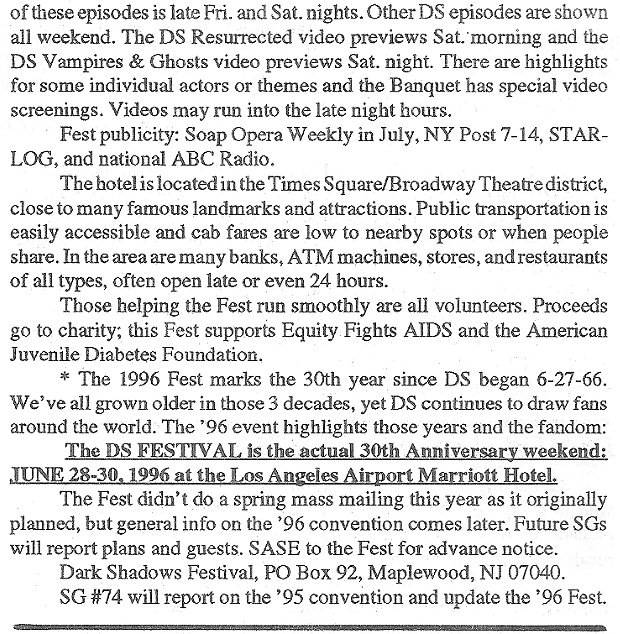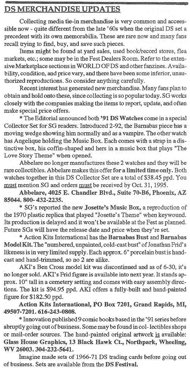 DS Alamanc were shared by SG #73 on its back inside page. In effect they printed both pages of a flyer similar to what's shared in reply #111 with the exceptions that instead of "Kathryn Leigh Scott" emblazoned across the top of the first page, it reads "THE DARK SHADOWS ALMANAC" - and instead of being dated "June 1, 1995," it's dated "July 1995." And also, just as with the version in reply #111, the "Special Hardcover Collector's Set IV" offer, which is part of the flyer shared in reply #113, is not offered. Thankfully the offer of that fourth set was included in the flyer in the mailing for the '96 LA Fest. But that mailing went out in November of 1995, so I suspect anyone who might have already taken advantage of one of the first three offers from the earlier flyer but would have taken advantage of the fourth had they known it existed might have been quite upset when they saw the updated flyer.