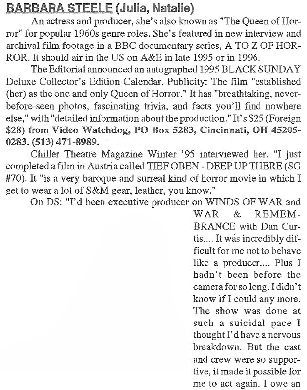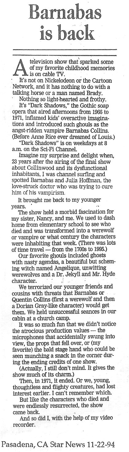 ). But sure enough at 11am the familiar music and voiceover thrilled my senses. And as I watched, I was so excited to see that it was an ep that I'd never seen during the original run because I didn't start watching DS until September of 1967. It was May 17, 1967's Ep #233, the one in which there's a violent thunderstorm at Collinwood as Barnabas tells Vicki and Carolyn the story of Josette's death on Widows' Hill. But I was also sad because my vacation was going to be ending before the next ep would air and at the time I didn't own a VCR, so who knew how long it was going to be before I could catch another ep. (But when I did I was beyond excited to realize it was a milestone ep: August 4, 1967's Ep #290 in which Julia discovers Barnabas in his coffin and then Barnabas goes to Julia's room to kill her only to discover she's been waiting for him. What luck was that?!