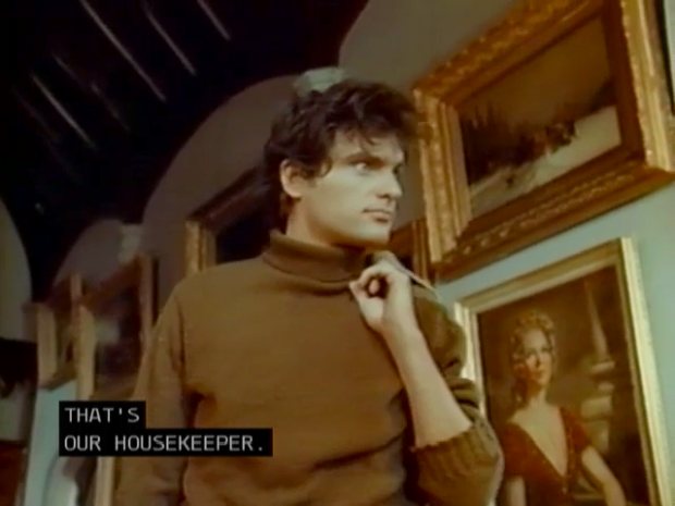 After Tracy tells Carlotta that the Gallery is her favorite room and that the view is incredible, and after Quentin stares at the portrait as Carlotta informs that she's prepared a salad and asks if she should serve it in the Gallery, Tracy's scripted response is added to as "Uh, well, yes, would you." - but neither the subtitles nor the closed captioning acknowledge the "Uh" - and then after Carlotta exits and Quentin begins to turn away from the portrait, Tracy gives a slight unscripted laugh, which the closed captioning acknowledges -
