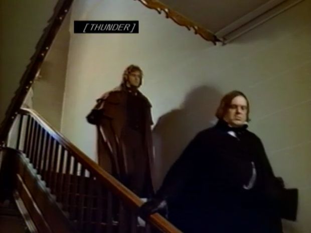 And in a similar situation to what I showed in Reply #1584 when it came to Laura's remark as she, Strack and Gabriel enter the Gallery, when it comes to Angelique descending the stairs, you can see above that she's barely seen when it comes to how my VCR decoded the text to acknowledging the thunder, whereas when it came to the text that was decoded with the TV from which I shot video, acknowledging the thunder remained on view until Angelique had indeed come into view -
