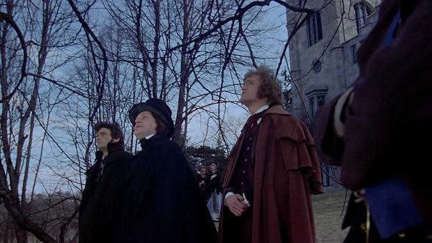 - he's seen standing on stairs higher than the ones Charles is on and behind Angelique and Sarah - and notice that unlike what the script indicates, he is not holding a blood-soaked kerchief to his face. (And get your minds out of the gutter because Sarah and Angelique are not looking at Angelique's ample bosom but down at the locket after Angelique says "Here" and before she pulls the locket off.)
