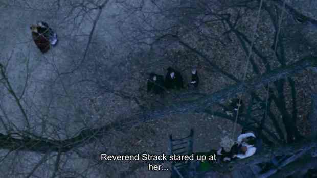 Carlotta's narration of the start of Scene 126 is also unscripted. She says: "Finally the rain stopped and a cold wind swept the grounds. It was then I saw her, high in the tree, a rope around her neck. Reverend Strack stared up at her, his face a mask of hatred." - and the subtitles -