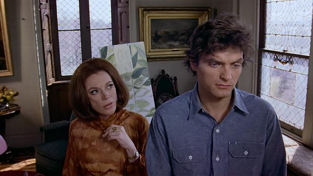 When it comes to DC, first up he has a note that the camera will pan with Quentin and lose Carlotta as Quentin gears up and delivers the line that Angelique's spirit is still alive in the house, but while the camera does indeed pan with Quentin, losing Carlotta in the process would be sort of hard to do when, as we can certainly tell from the first capture above, Carlotta isn't even in the shot - she doesn't appear in the shot until Quentin just about reaches his painting, so in reality, Carlotta is gained in the pan, not lost. And DC's second note says that Carlotta will cross into the shot after Quentin says that Angelique's spirit is still alive in the house - but, again, that would be sort of hard to do when she's already in the shot before Quentin says that. And DC's third note is that Quentin will turn back to us before he says he's not Charles - but obviously that doesn't happen either. The one note that does actually take place in the film is DC's fourth, where he says that Carlotta will cross to Quentin before she reveals that he'll realize that there's no place in the house for Tracy.