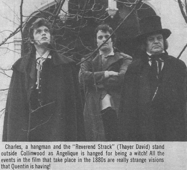 Interestingly enough, the "Angelique Collins, you have been condemned as a witch and you must die as a witch. Let your soul be returned to the pits of darkness forevermore" part of the dream's voice over is the way it's written in the script for the hanging, but it's actually delivered as "Angelique Collins, you have been condemned as a witch and you must die. But your spirit will not live after you for your earthly remains will hang her until your spirit returns to the pits of darkness forevermore."