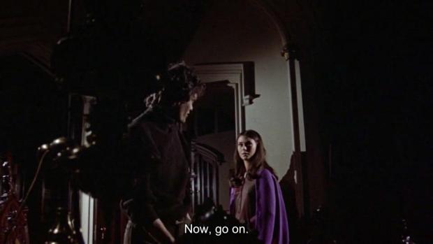 But Scene 145 was actually used in the film, as the first part of Quentin's dream on his first night at Collinwood. However, the scene doesn't begin as scripted because there are no shots of the silhouette of a man on horseback galloping out of a heavy bank of fog - and neither do we see the horse rear on its hind legs as we recognize the rider as Charles Collins - nor does he slash his riding crop into camera as he screams Monday's quote. In fact, what we do see, as can be seen in Monday's capture -