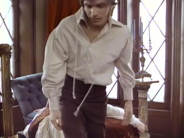 And as far as the differences in the descriptions and directions go, Charles and Angelique do a lot more than smile at each other while they don't answer. Actually quite a bit more, depending on the version of the film one sees.  [naughty]  But here we're working with the 94 minute version, so all we see in it is Charles and Angelique kiss before he gets up and Angelique tells him to let Gabriel in. And I do have to say that that chaste version of what goes on between Charles and Angelique always strikes me as funny because all it looks like Charles does is pick a piece of lint from Angelique's cleavage - but if you've never seen what actually takes place in the longer versions, you might be quite surprised when you do see it!  [b003]  Though keep in mind that it's '70s' R-rated, not X-rated.  [ghost_nowink]