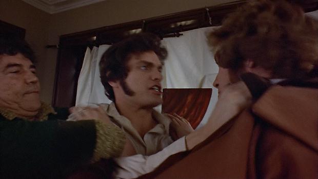 And speaking of what's different from the descriptions and directions, Gabriel doesn't just stare at Charles after Charles asks him if he's lost his mind because in the film Charles' attention is immediately turned to Strack once he enters the room and Gabriel's attention is soon focused on what's about to go on with regard to Angelique - and Charles doesn't look at the two men holding him because, again, Charles' circumstances are different in the film, so it will come as no surprise that it's also a case that the two men referred to in the script do not avoid Charles' eyes - and in the film Strack makes no attempt to step toward Angelique, nor do we even see her eyes blazing defiantly at him because as we can see in today's capture -
