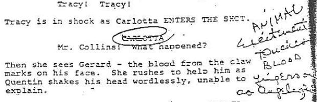 - and not Samantha. In fact, it's interesting that in the scenes in DC's script where Samantha's name still appears (it was changed to Laura in the rewrites involving her), it's never crossed out and replaced with Laura, whereas in Grayson's script Samantha's name is nearly always crossed out and replaced with Laura even if Carlotta doesn't appear in any way in the sequence.