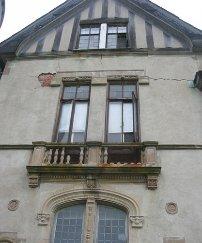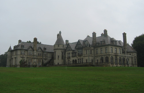 On Monday, John_in_SC and I took a very early train to Rhode Island and made our way to a certain house by the sea.  The good news is that restoration has just begun on the solarium, the room at the lower far right of the back of the house.  You can just see a ladder propped against the side of it.  It was raining steadily when this photo was taken: